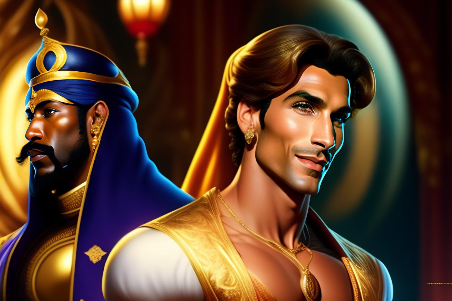 Aladdin al lui Disney se confruntă cu Jafar. În textul original sunt trei personaje negative. Primul este un magician rău din Africa. Acesta se dă drept un unchi dispărut al protagonistului. Scopul său este de a-l trage pe sfoară pe băiat. Al doilea este fratele rău al magicianului. Al treilea personaj negativ este fiul vizirului, rival cu afecțiunea lui Aladdin pentru prințesă.